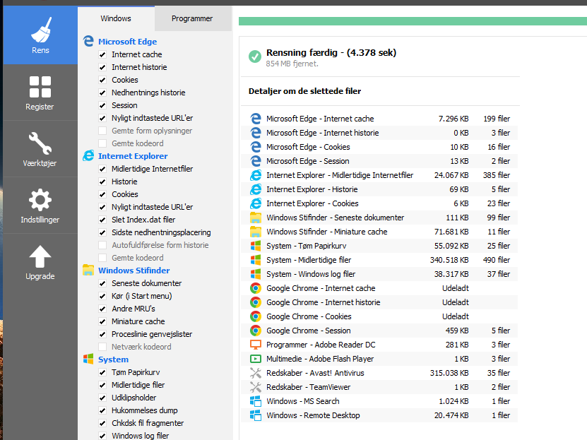 Jeg kørte min CCleaner for 2 uger siden – Og her i dag kørte jeg den igen. 854 MB fjernet fra harddisken! CCleaner har en gratis version, som er tilstrækkelig til den almindelige bruger.